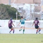 後半は、茨城大学のキックオフで試合が始まる。中盤のラックから茨城大学⑨宮下が左サイドを抜け、相手の裏のスペースにキックを蹴り込み、相手陣ゴール前へ。
