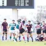 その転がったボールを東北大学が拾いタッチに蹴り出してピンチを脱出。茨城大学は、さらに、22m内ラインアウトからモールを作り押し込む。その後、連続でサイドアタックを試みるが、東北大学がターンオーバー。