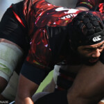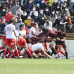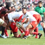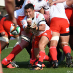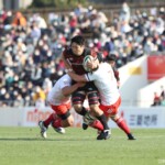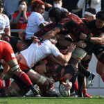 直後の前半30分、相手ペナルティーから地域を進めたブレイブルーパスは、ラインアウトからモールで前進。防御の機会を与えずそのまま左中間に⑦トッドが押し込みトライ、コンバージョンも成功し21−7と追い上げる。