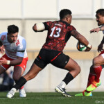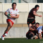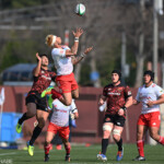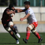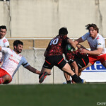 勢いのついたブレイブルーパスは後半17分、相手陣ゴール前の攻撃からBK展開、ゴール中央の密集からこぼれたボールを奪い、㉒ストラトンが中央にトライ。コンバージョンも成功し27−21と逆転圏へ。