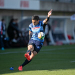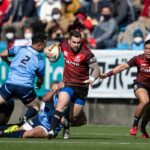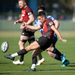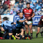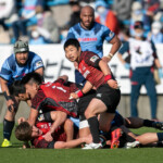 その後は、お互いに相手陣に攻め込むもトライに結びつかず、攻めあぐんでいたが、前半終了間際、ヤマハはペナルティで得た敵陣ゴール前ラインアウトからモールを押し込み、SH矢富勇毅が左隅にトライ。8-12と追い上げ、前半を終了した。