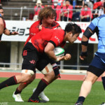 序盤からテンポよく攻め込むヤマハは、14分にも10m中央ラックから右に振り、FB⑮五郎丸の突破からのチャンスにパスを受けたCTB⑬石塚弘章が押さえた。Gも成功し19―0と着実に加点。