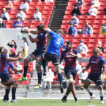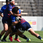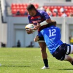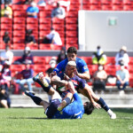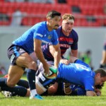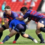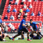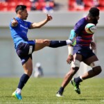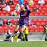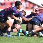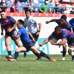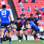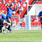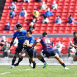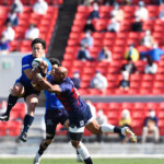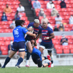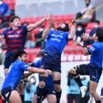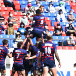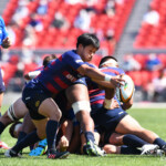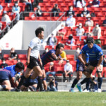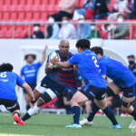 序盤からチャレンジャーの近鉄は積極的にアタックを繰り返し、SO⑩クウェイド・クーパーの巧みなボールさばきや1月の天理大学日本一の立役者であるルーキーCTB⑬シオサイア・フィフィタ、FB⑮セミシ・マシレワの突破で再三パナソニック陣に攻め込むが、そこは王者パナソニックも落ち着いて受けて立つ。一進一退の攻防が続く中、均衡を破ったのは近鉄。16分に10mL付近の密集からFB⑮マシレワが右サイドを大きくゲイン、最後はWTB⑭ジョシュア・ノーラが右中間に抑えて7-0と先制した。