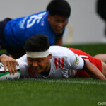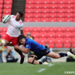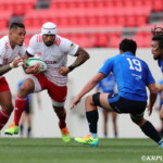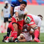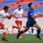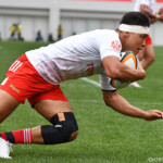 ノーホイッスルトライ。しかしトヨタもすぐに反撃。5分、CTB⑬ロブ・トンプソンがディフェンスの隙をついて突進し、最後はFL⑦古川聖人がトライを奪った。