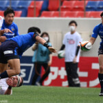 後半は、トヨタのタックルが甘く、徐々に動きが鈍くなり、後半から吹き始めた風上も味方にできなかった。対するパナソニックは20分、相手G前5m右ラインアウトから左へ展開し、17分からWTB⑭梶伊織に替わった㉒山沢拓也が相手タックルが甘くなったところを突いてトライ。SO⑩松田のGが右ポールに当たるものの内側に跳ねて加点する。27-21。