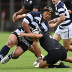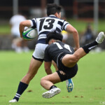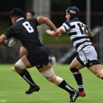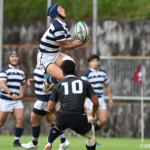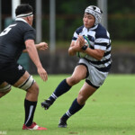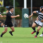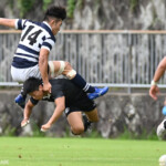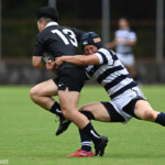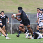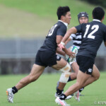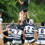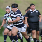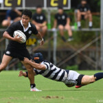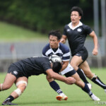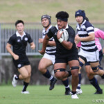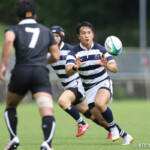 この後、少し膠着状態が続いたものの12分、今度は大体大、自陣10M付近でのカウンターアタックから、LO④ツボウ・マヘがビッグゲインし、SH⑨三浦裕次郎が右中間に走りこみトライ。ゴール(SO⑩越智幸久)も決まり振り出しに戻す。(7-7)