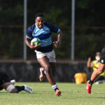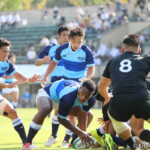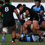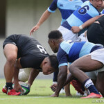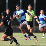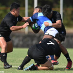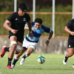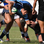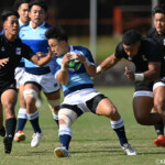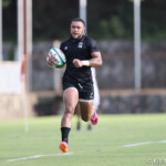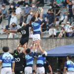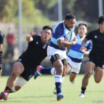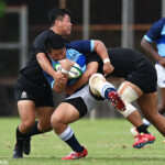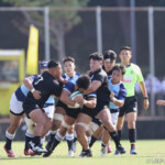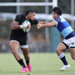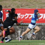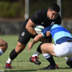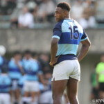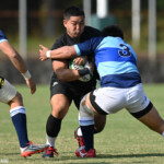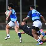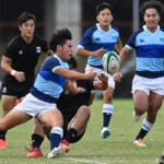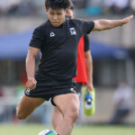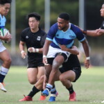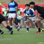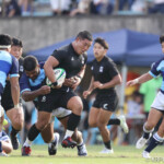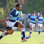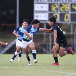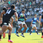 9分、HL付近で摂南大がハイパント処理をミス、天理大はターンオバーから右に展開、⑭トゥイアキがライン際を走り抜け、フォローしていた⑩筒口に返しパス、そのままゴール中央まで走りこみトライ、自らGKも決めて引き離す。(19-0)