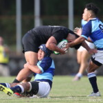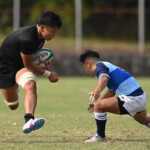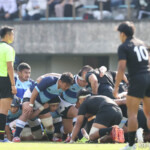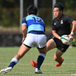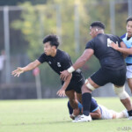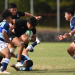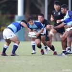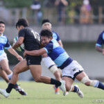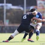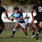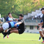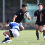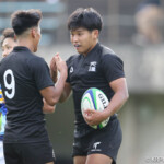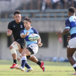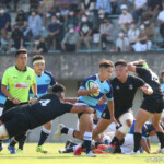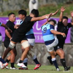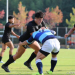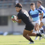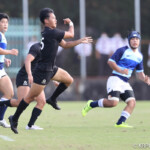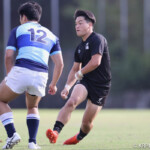 長いロスタイム、天理大がゴール前に迫る時間が増えるが、摂南大もよく守る。49分、HL付近で摂南大パスミスを天理大FL⑥鄭兆穀が足に引っ掛けドリブル、ゴール内に運んだボールを相手に走り勝ちトライ。ゴール内で相手選手のノーボールタックルもあり、認定トライとなる。ここで前半終了。(12-0)
