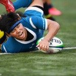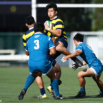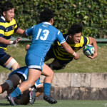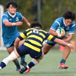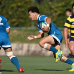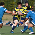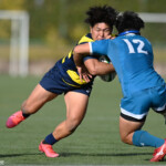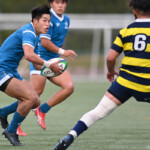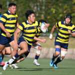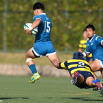 近大は23分にもキックオフリターンからFB⑮河井優がインゴールへ蹴り込み、相手ミスをSH⑨松山翔輝が押さえリードを広げた(SO⑩半田G成功、21-5)。
