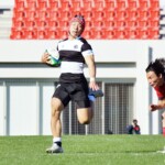 30分、龍谷大がゴールに迫るも、守り切った大体大が自陣ゴール前5Mスクラムを押しペナルティーのアドバンテージのなか果敢に展開、⑫越智が相手裏にショートパント、WTB⑪竹林珠夏がナイスキャッチし、⑬戸羽にパス、そのまま60M走り切ってゴールポスト右にトライ。⑫越智がゴールキックを決め引き離す。(17-3)