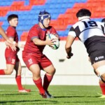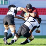 3分、大体大は自陣10M付近スクラムから、WTB⑭岡本滉海のゲインやFL⑦吉田海の好走でゴール前に迫り、最後はNO8⑧マネ・シオネが体格を活かし右中間に飛び込んで先制する。(5-0)