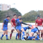 双方1トライずつ獲得し、キックでの地域の争奪にゲームは進行していく。キックの攻防から抜け出したのは、追手門学院大学。