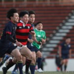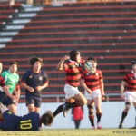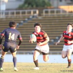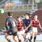 松山大学も粘り強いディフェンスを続けるも、前半18分、東北学院大学が相手陣22m付近のラックから右に展開、アウトサイドを突破して⑪荒木田が右中間にトライ、ゴールも決まり14-0となる。