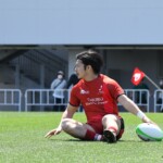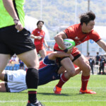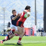 後半に入ると、中部電力は、後半1分、ハーフウェイライン相手陣中央のマイボールスクラムから、右へ㉓長野→⑩鬼木→㉒野々山とボールが渡ると、㉒野々山が自陣10mからスワーブで相手ディフェンスをかわすと右タッチライン沿いを約60m走り切りトライ、⑩鬼木のコンバージョンも成功し、21-14とする。