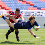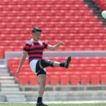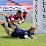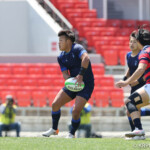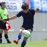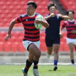 京産大は6分、相手キックオフから左サイドで相手陣に入り、右に回し、大外で待っていた7番シオネ・ポルテレがパワーで右隅にトライ、同点に追いつく。(G不成功、12-12)