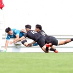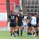 後半3分:近畿大学が自陣から流れるようなパスを回して相手陣内に。そこからも上手く相手をかわしながら、最後は⑧石川選手から⑪藤岡選手にパスが繋がり、右サイドにトライ。同点に追いつく。(天19-19近)