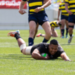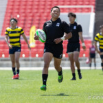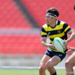5分にも、敵陣25M付近でまた④高岸がブレーク、パスを受けた㉑小松頼斗がゴールへ走り込みトライ(12-0)。