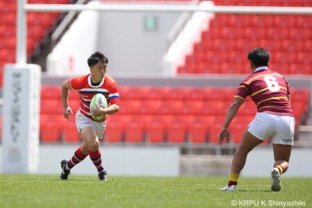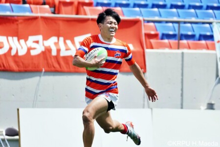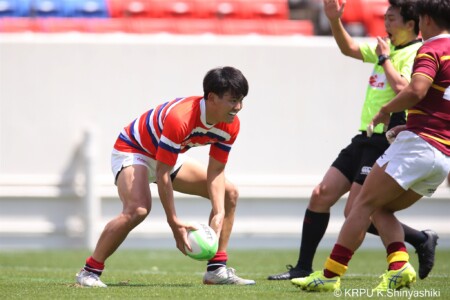8分も中京大。相手の攻撃を凌いだ後の逆襲。②新田汐恩のトライ、⑩谷中簾のGK成功で逆転し、ハーフタイム。5-12