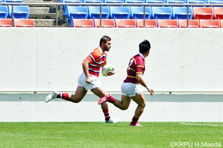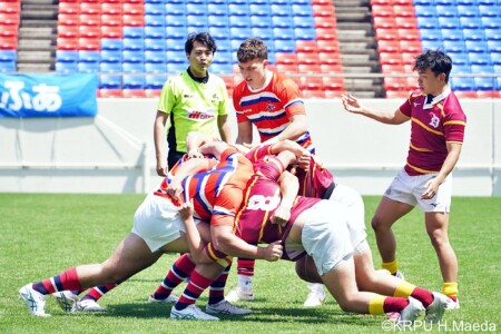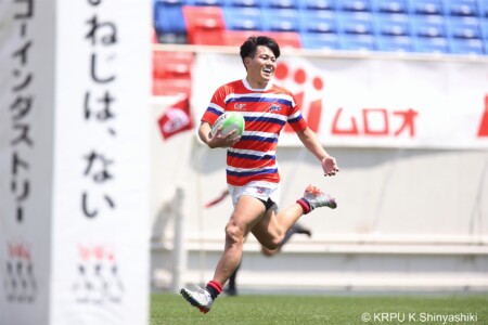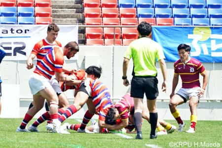 2分、先制は同志社。敵陣22M内での相手ノッコンボールを⑥ファイアラガ・義信ダビデが拾って左中間にトライ。5-0