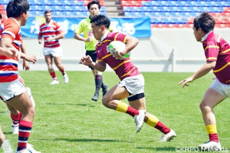 1分、後半先制は中京大。自陣から我慢強くボールを運び、最後は⑧ムートンが右中間にトライ。5-17