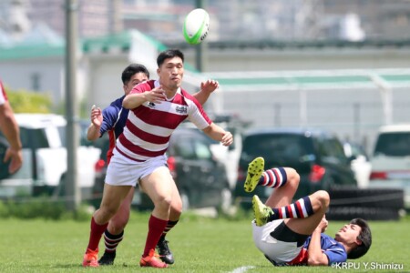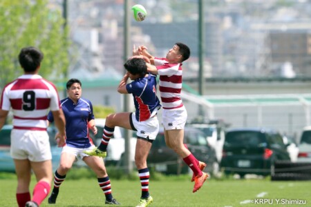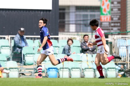 千里馬15番南紀成のキックオフ。開始早々の1分、5番中西健人から15番南にオフロードパスが通りトライ、千里馬が先制した。(G不成功、0-5)千里馬は4分にも9番徳井清弥が右すみにトライ(G不成功)して0-10と点差を広げた。6分、兵庫がようやく得点を返す。中央付近で1番江本純が敵のパスをインターセプト、そのまま50mを走り切りトライ、9番朝見直人のゴールも決まり7-10と3点差に迫った。千里馬はロスタイム8分に9番徳井がHL付近から2人をかわして中央にトライ、自らゴールを決めて7-17、10点差で前半を終えた。