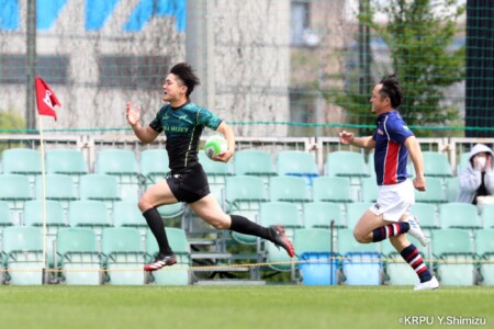 後半3分:奈良が右サイドから左サイドに大きく展開し、最後は奈良【4】上畠選手が相手を振りきり左サイドにトライ。(奈良10-12兵庫)
