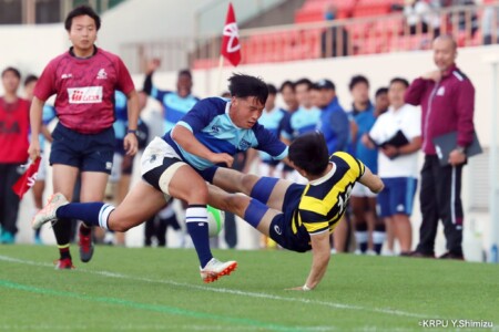 4分、摂南大がキックから攻め、立命大のキック処理ミスをつき1番河野が左中間にトライ、GK不成功。14-29