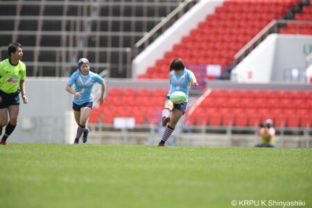 7分、追手門の12番松田が中央にトライ、GK不成功。26-0で前半終了。