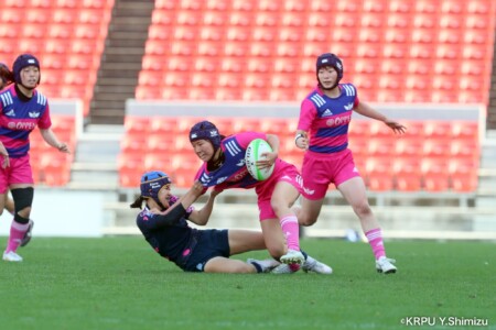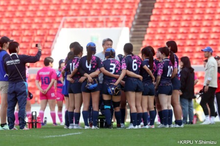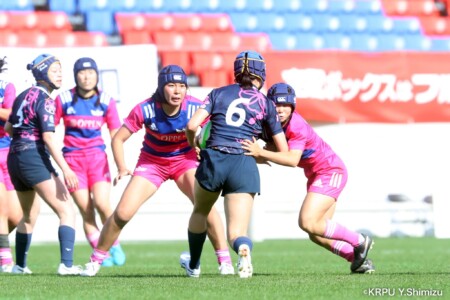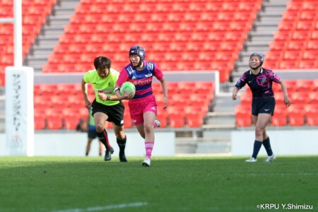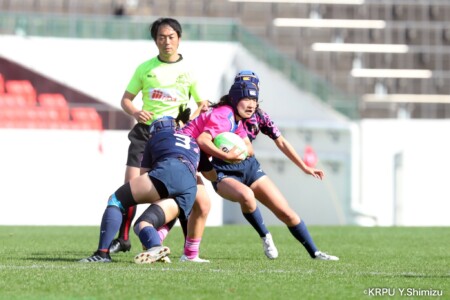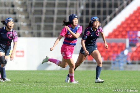 後半3分に追手門12番松田が中央ラックから抜け出して中央にトライ自らゴールも決め22―5と引き離すが、四国大学は6分に1番尾崎夏鈴がゴール前ラックからトライ、続いて7分にも11番西 真央も同様な形でトライと追い上げるが反撃もここまで、22―15と追手門学院が四国大学を振り切った、点差が表す通り力の拮抗したナイスゲームだった。(文責:北畑幸二)