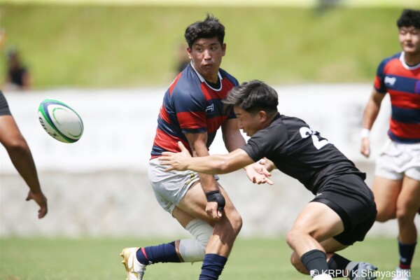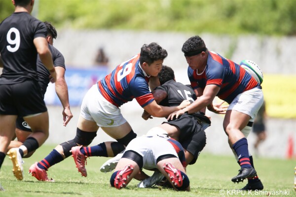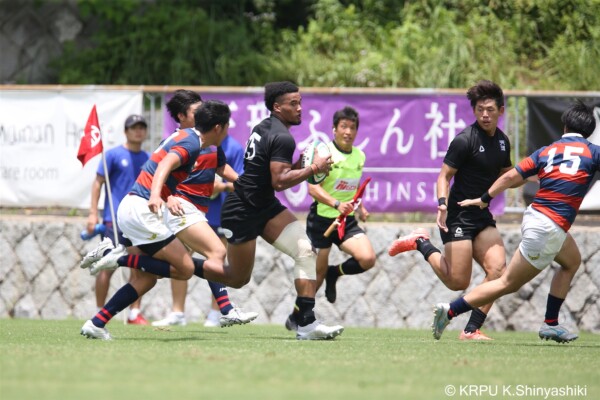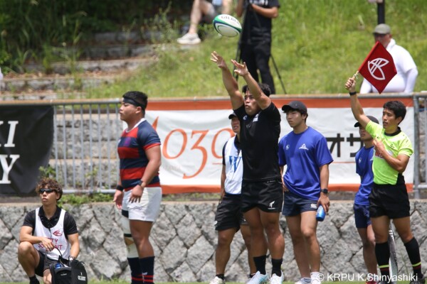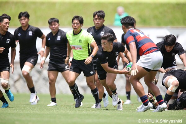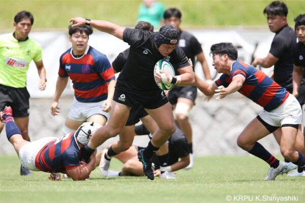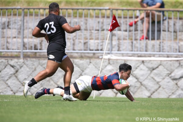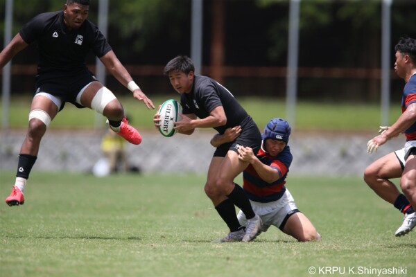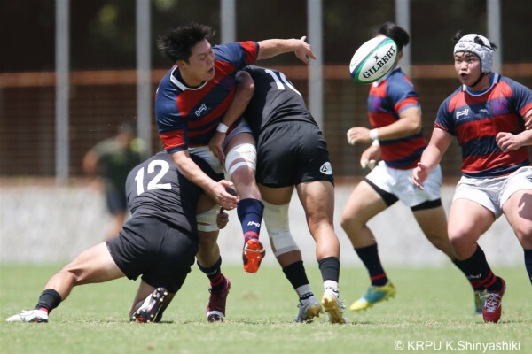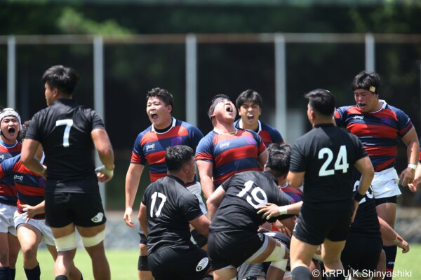 しかしここから暑さのせいかゲームが動かなくなり後半33分に関学大がゴール前スクラムから右へ展開し6番木下裕翔がポスト右へトライ、23番澤田壮太朗のゴールも決まって14-47、35分には24番加藤匠朗がトライし19-47と追い上げるが反撃もここまで。