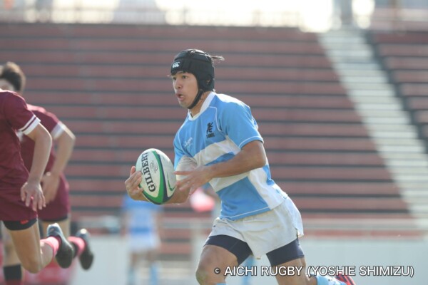 東京学芸大は、さらに、後半39分、ハーフウェイライン付近でのターンオーバーから攻め、相手陣22m付近で⑮岡田喬一がボールを受け取ると、巧みなステップでディフェンスをかわしトライ、コンバージョンも成功し、55−0とした。