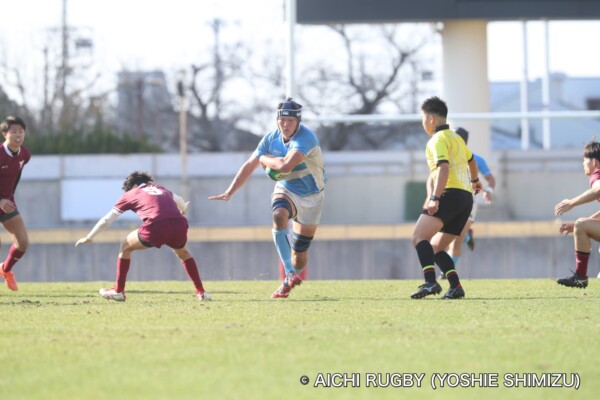 東京学芸大は、茨城大のアタックを堅守すると、前半18分、ハーフウェイラインのスクラムから相手陣22mへキック、タックルからターンオーバーし、ゴール前へ、そこから右へ大きく展開し、⑫光宗竜助が右中間へトライ、17−0。
