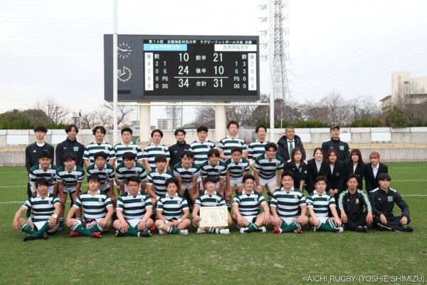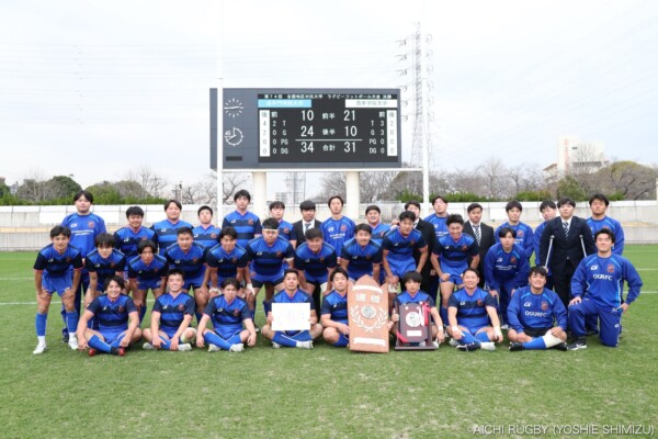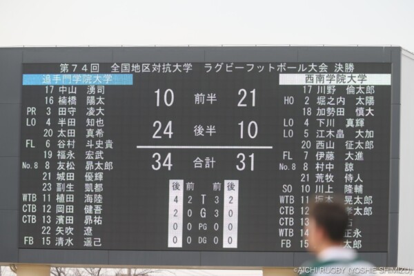 最後のチャンスに賭けた西南学院大学だが追手門学院大学が冷静に防御、最後はボールを奪い返しそのままノーサイド、終始スクラムで優位に立った追手門学院大学が、34-31のスコアで2年ぶり2回目の優勝を遂げた。