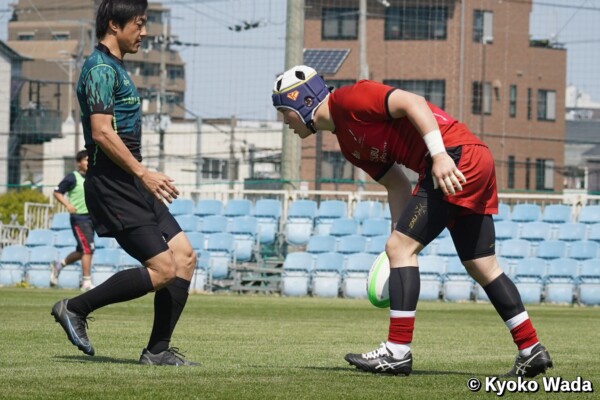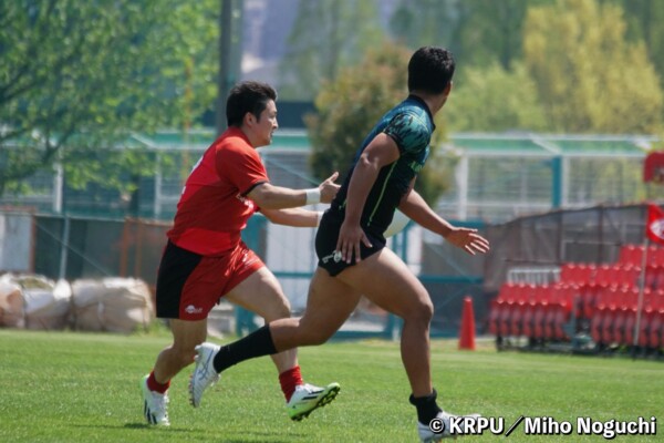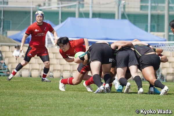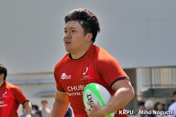 昨年度優勝の中部電力の15番笠原 浩史がキックオフのボールを拾い中央へトライ、ゴールキックも決めて7点先取、続いて6番鈴木 康生が8番石田 翔吾からのクロスパスを受けて中央へ鮮やかなトライ、15番笠原のゴールも決まり14-0、4分にはスクラムから9番西川 敢太が持ち出してトライし21とリードを広げる。