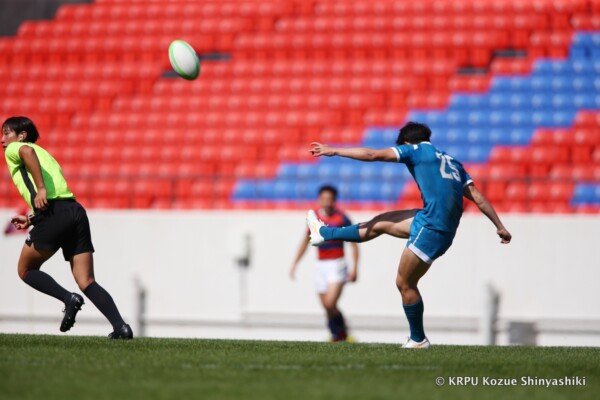 1分、まず㉓武藤航生で近大陣内に入りラック、そのラックからパスを受けた⑳下元が中央にキックパスのようなパントを挙げる。そのボールが⑭的場天飛に入り中央にトライ。(⑭的場G成功、21-14)