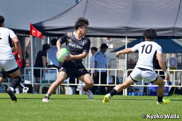 リコージャパンが上げたキックオフボールをキャッチした大阪府選抜14番佐々木 悠人がタッチライン際を激走しゴール中央にトライ、自らゴールキックも決めて7点先取する。