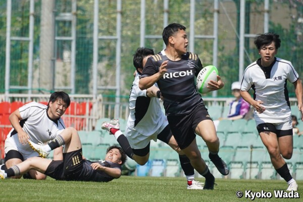 後半早々に、リコージャパンのパスをインターセプトした大阪府選抜13番柴崎 央志が中央にトライし5-24と引き離すが、リコージャパンは4分に15番高田が2本目のトライをあげ、11番友池 瞭太がゴールを決めて12-24と追い上げる、しかし6分に大阪府選抜10番津留も2本目のトライをあげてリコージャパンを突き放した。