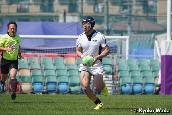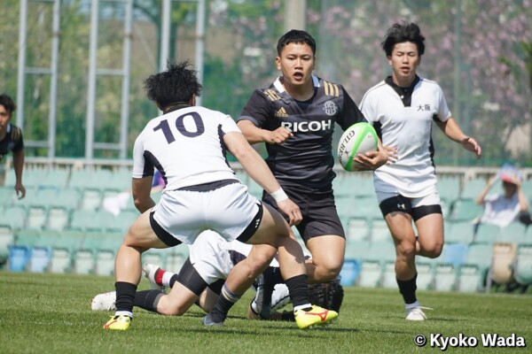 その直後の4分に大阪府選抜は中央ラックから右へ展開し10番津留 修平がトライ、ゴールも決まり5-14、続いて7分に14番佐々木が今日2本目のトライをあげて5-19で折り返す。