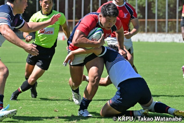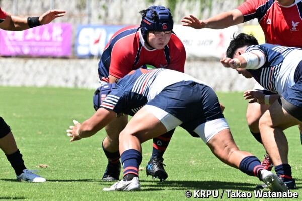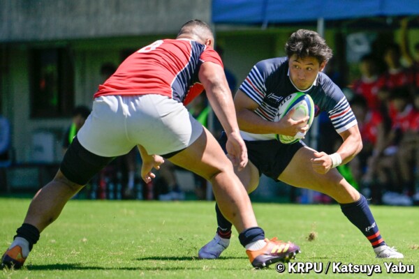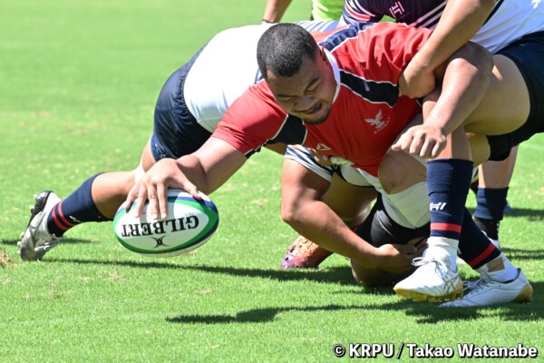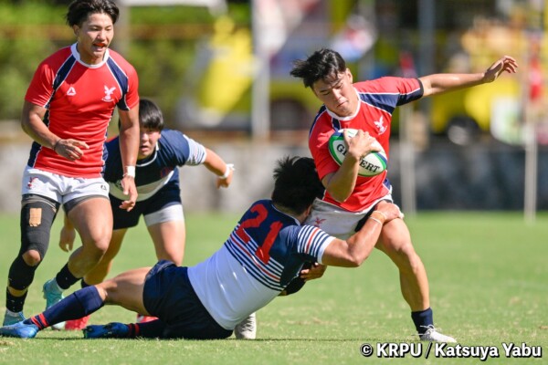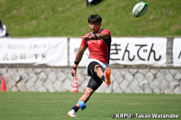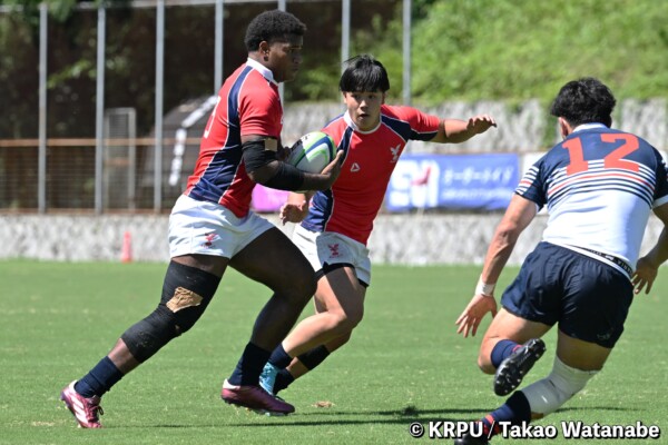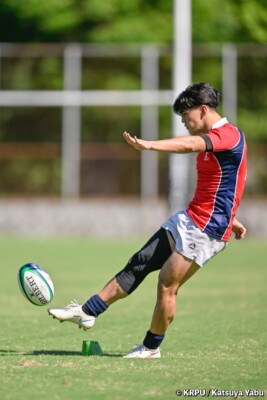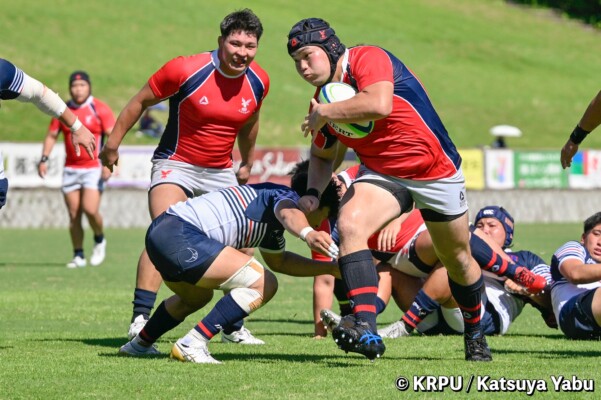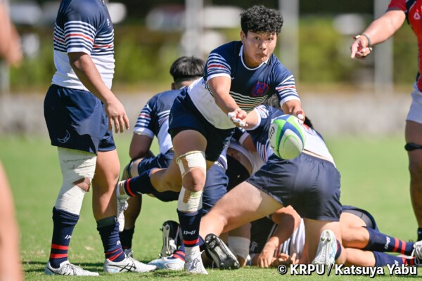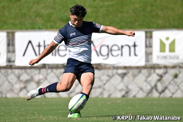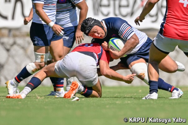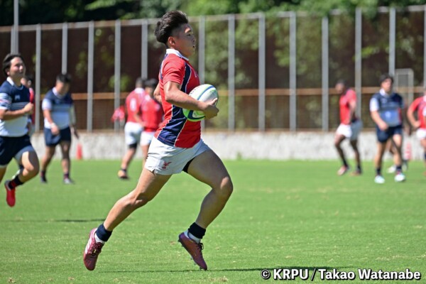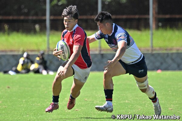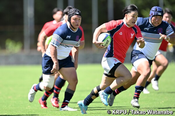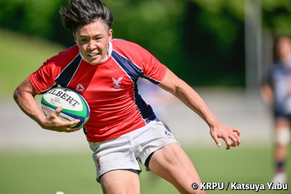 だが、ここから関学大は切れることなく、13分にHO②平生翔大、16分にFB⑮的場天飛、19分にはSH⑨川原大がトライ(すべてゴール成功)し、意地を見せる。(66-42