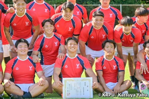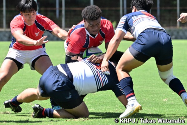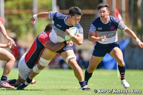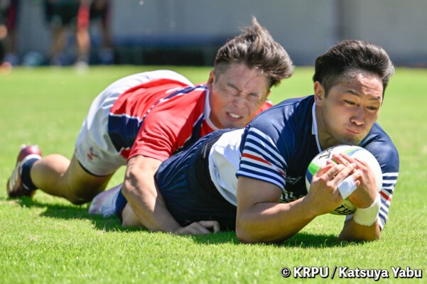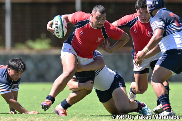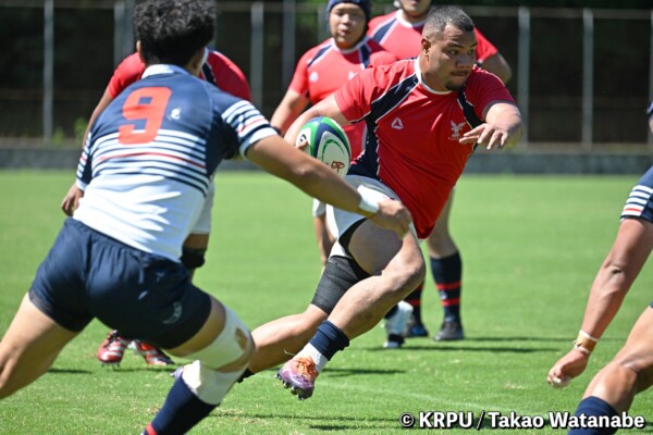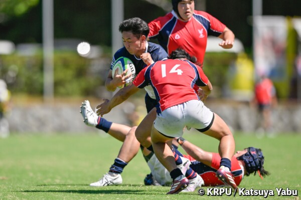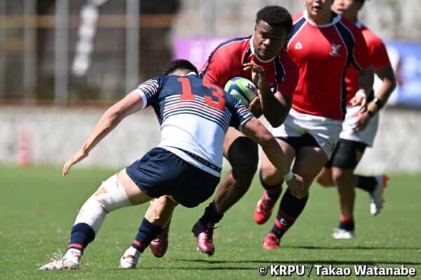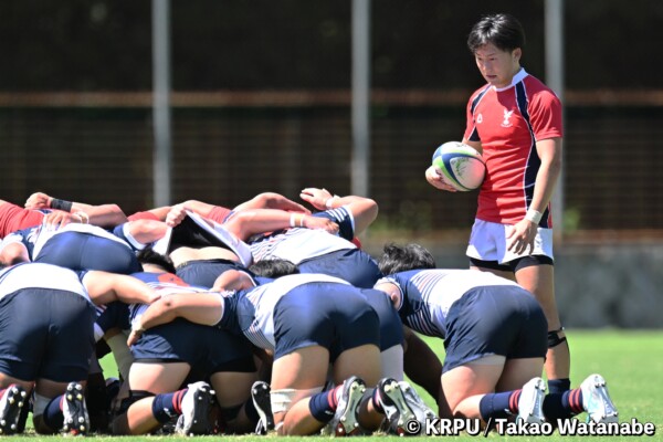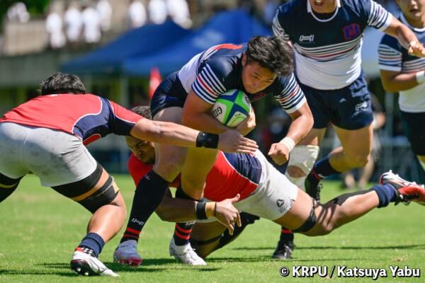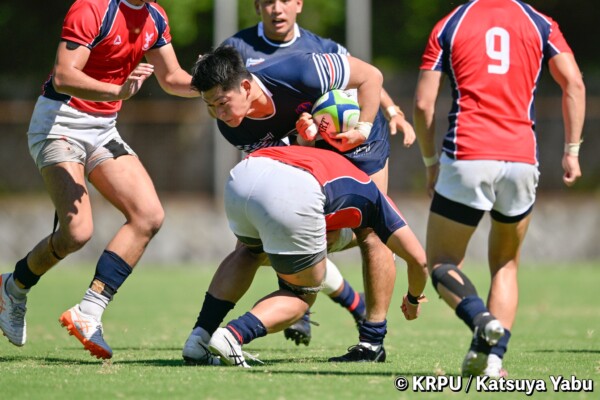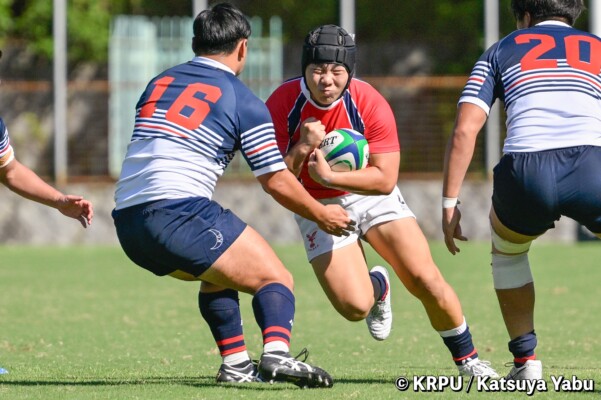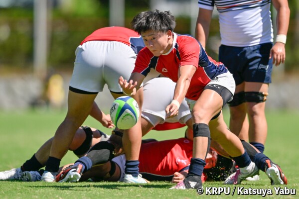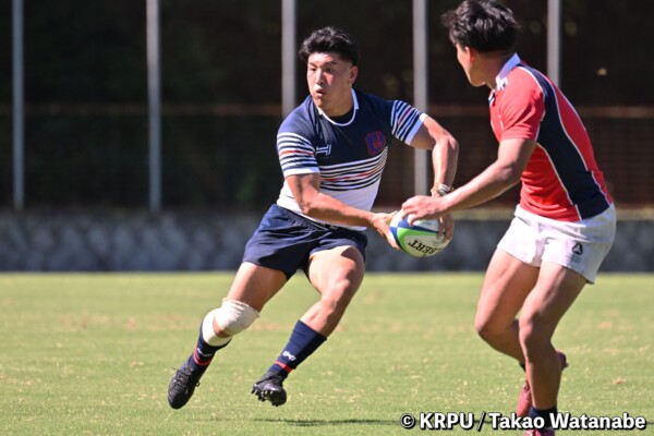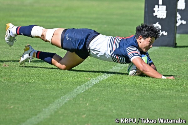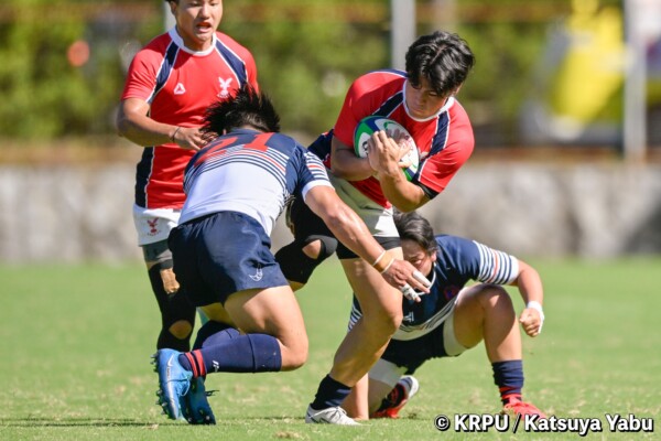 だが、ここから関学大は切れることなく、13分にHO②平生翔大、16分にFB⑮的場天飛、19分にはSH⑨川原大がトライ(すべてゴール成功)し、意地を見せる。(66-42