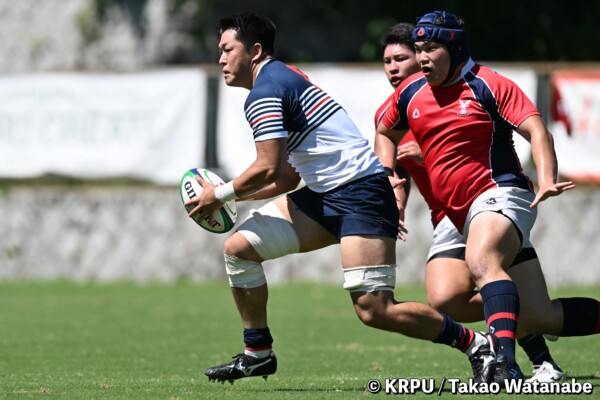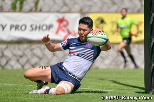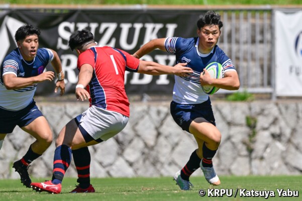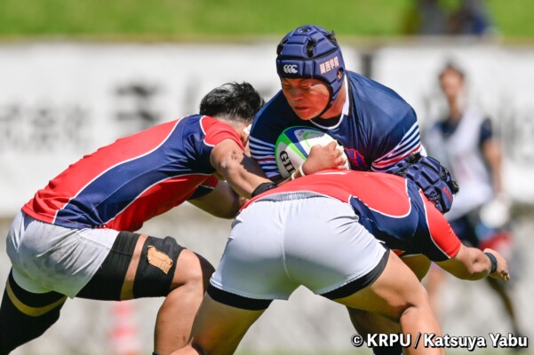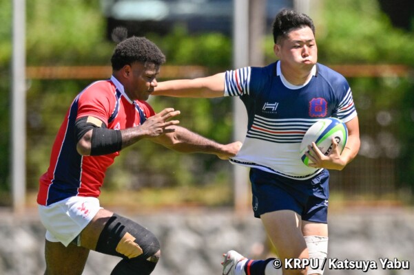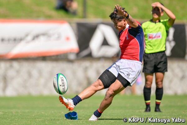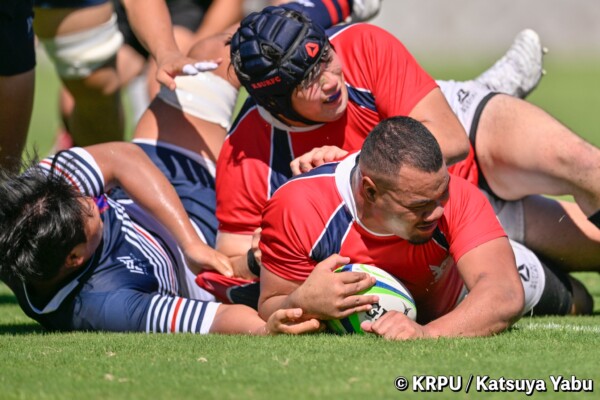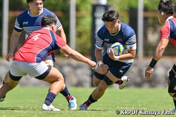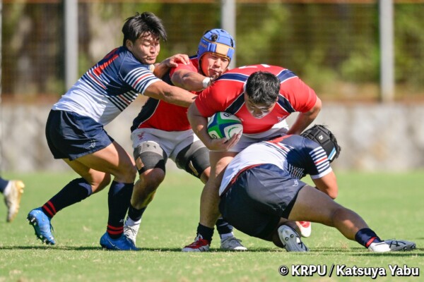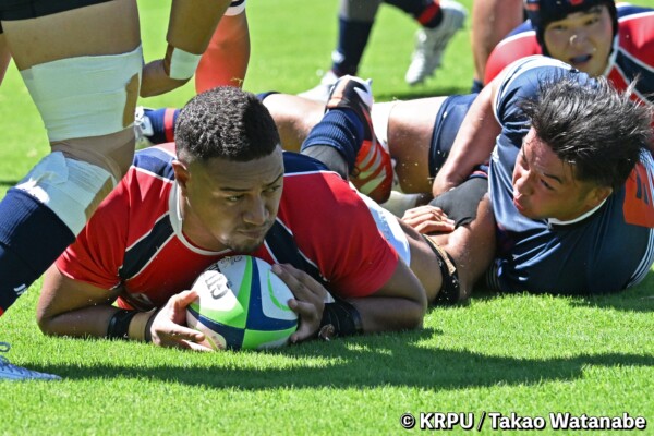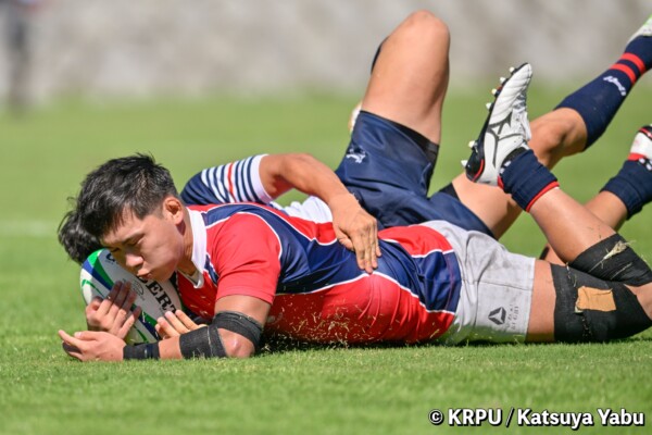 開始早々1分、京産大が先制した。敵陣10M付近ラインアウトからNO8⑧シオネ・ポルテレとPR①曽根隆慎が強烈な当たりでゲイン、SO⑩吉本大悟からCTB⑫藤本凌聖にパス、そのまま30M走り抜けてゴールポスト下にトライ。ゴールはFB⑮辻野隼大が決めて先制。(7-0