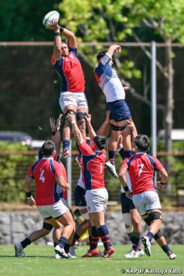 35分にも京産大。ゴール前5Mラインアウトからサインプレーミスだったが、LO④日吉健がボールキャッチし、そのままトライ(ゴール成功)と引き離す。(40-14