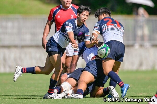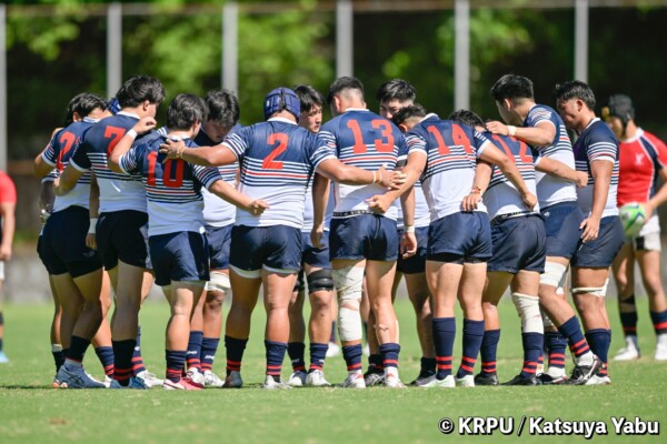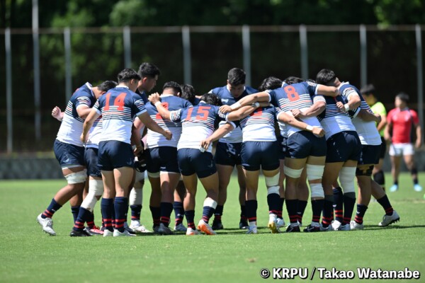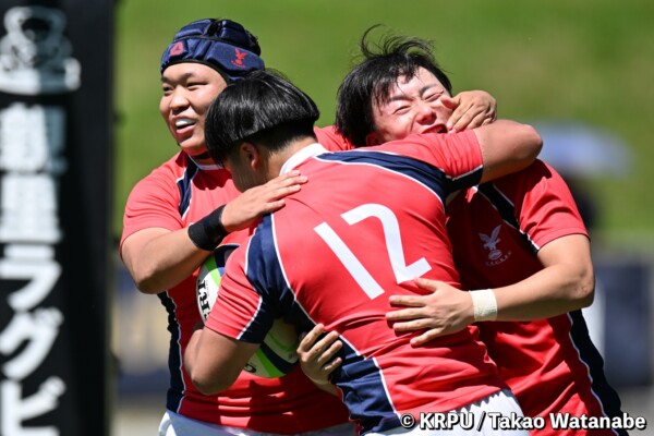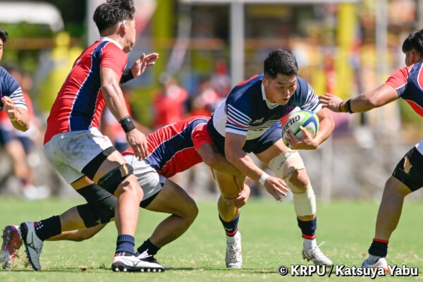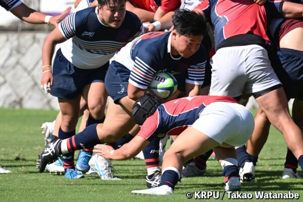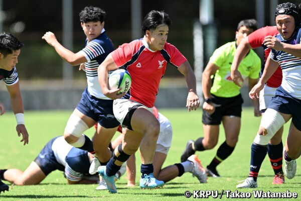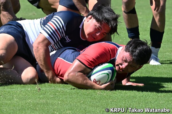 だが、その後すぐの43分、関学大ゴール前のミスからWTB⑪林総太が右中間にトライを奪い、リードを広げて前半を終える。(45-21
