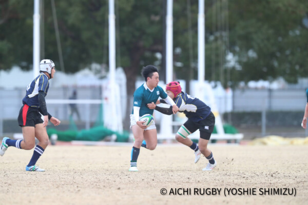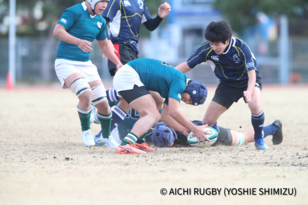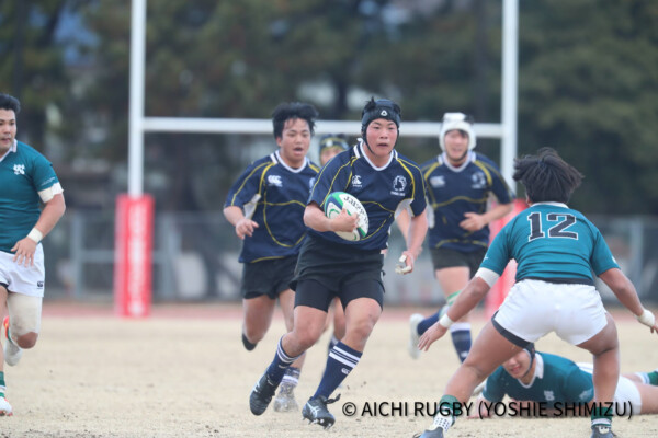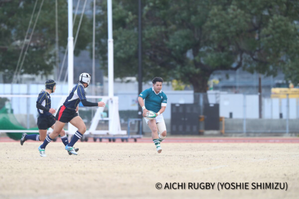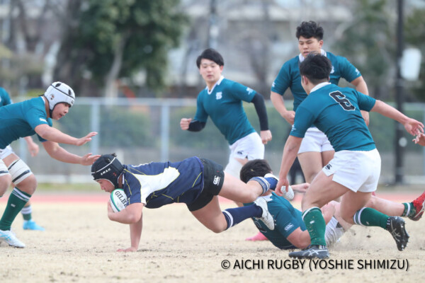 それでも東北大学は、前半39分、相手ゴール前スクラムから前進するとペナルティーを獲得、速攻で攻めて最後は㉑星野陽紀が右中間に押し込みトライ、コンバージョンも成功し7-12とする。