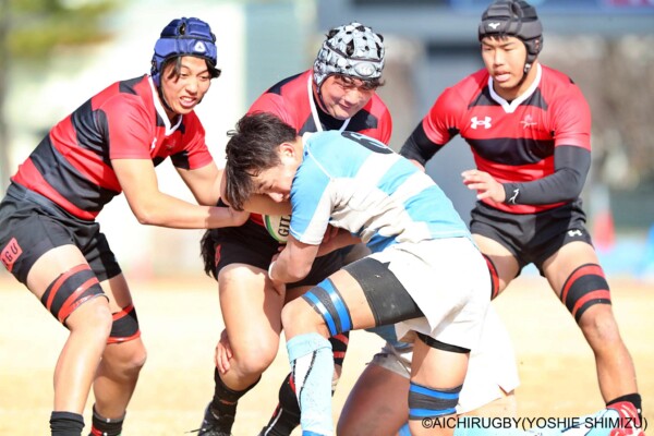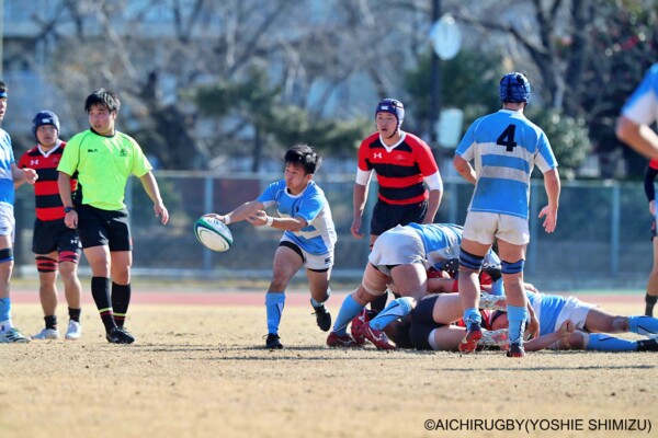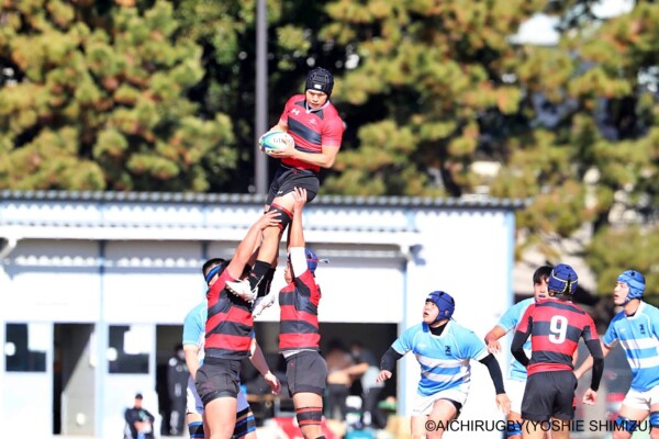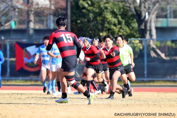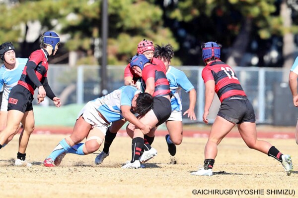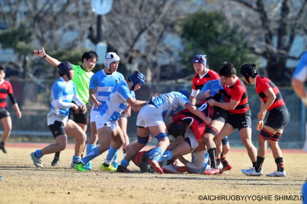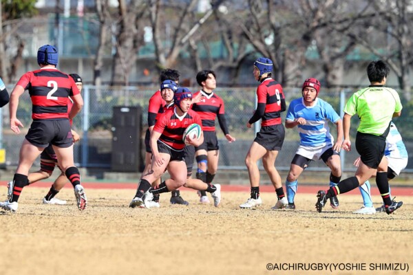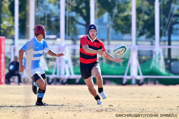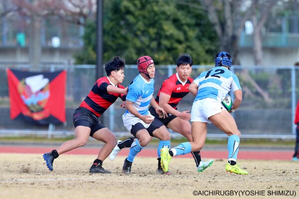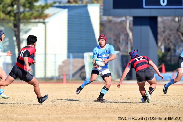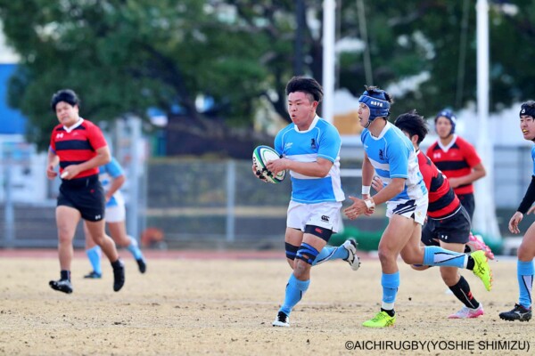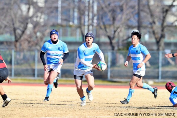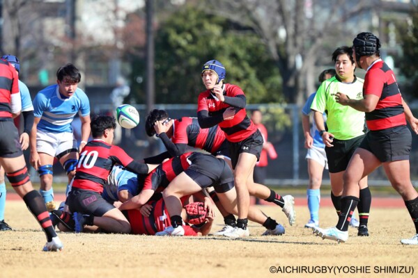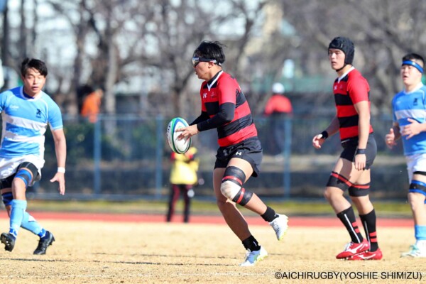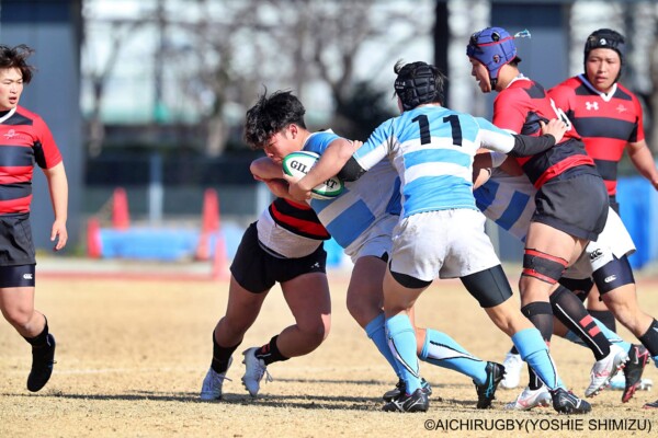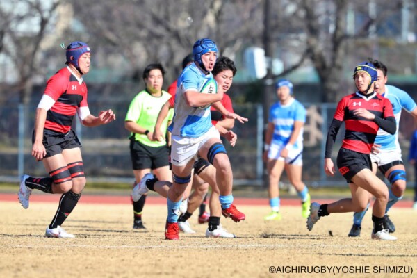 愛知学院大は、相手陣へ攻め込むも、パスミス、ノックオンで決定機を作れない。