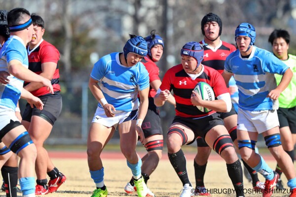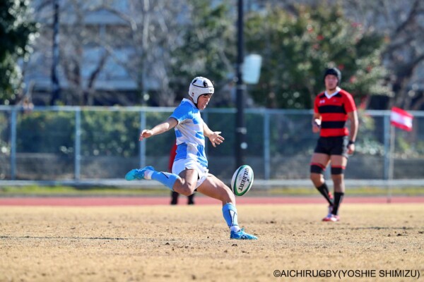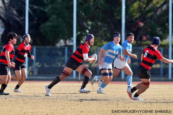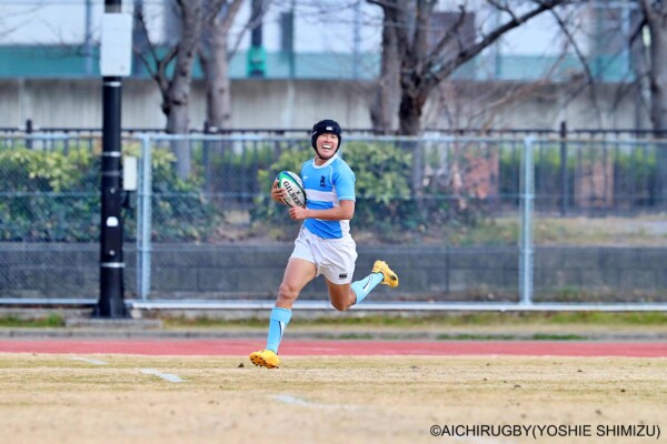 その後、愛知学院大が2度のペナルティーからクイックスタートで攻めるも、東京学芸大が自陣ゴール前5mでターンオーバーし、左へ展開、⑫木村粋雅がHLを超えたところで相手を振り切り、後半16分、ゴール中央へトライ(⑭竹内コンバージョン成功)、43-0とリードを拡げる。