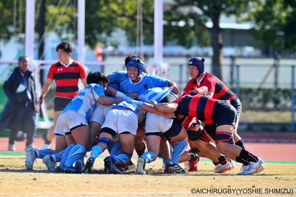 愛知学院大は、自陣22m内側から攻撃を仕掛け、⑪筒井竜斗のビックゲインから相手ゴール前まで迫るもターンオーバーされる。さらに、相手陣で試合を進めるがノックオン、ノットストレートとトライに至らない。
