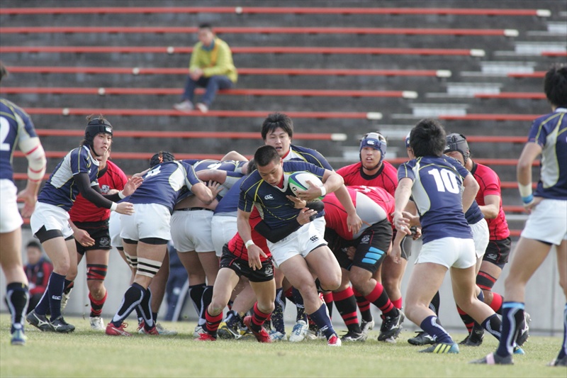 薄い雲間から暖かい日差しが注ぎ、弱風のコンディションの中、日本文理大学のキックオフで試合が開始された。開始早々に日本文理大学はキックオフからボールを獲得するとラックサイドをFWが削り最後は⑥田中がインゴールに飛び込んだ。ゴールも成功し、7−0と早々にゲームが動いた。対する松山大学は風上に立ち効果的にキックを活用しエリアを獲得しにいく。しかし接点で日本文理大学が上回り、なかなかトライまで繋げることができない。その後、どちらも決定的なチャンスが生まれず均衡状態が続いた。22分に日本文理大学はシンビンで1人一時退場。すると、松山大学はこのチャンスを活かし敵陣22m中央ラックから右に展開すると⑤杉野が右隅に飛び込んでトライを返した。しかし、数的不利な日本文理大学ではあるが大型FWが確実にゲインラインを越えると、前半28分に③渡辺がトライをあげた。前半終了間際にも⑪山嵜がトライをあげ、21—5と日本文理大学がリードした。