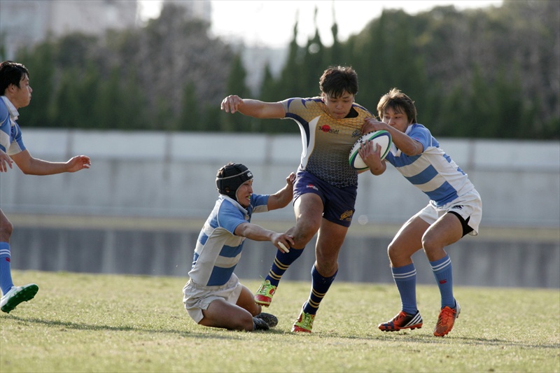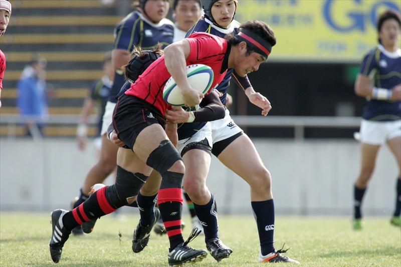 1回戦同様の強風の中、風下の中部大学のキックオフで準決勝第2試合が開始された。風下の中部大学は⑩渋谷を中心にフラットなパス攻撃でフェイズを重ねる。対して東京学芸大学は1回戦で見せた個々の粘り強いタックルで対抗、両チームを象徴するプレーでゲームがスタートした。直後の8分、中部大学のペナルティーでゴール前5mのラインアウトを得た東京学芸大学がラインアウトモールを押し込み、最後は①坂詰が右中間にトライ、5−0とゲームが動いた。その後、中部大学が中盤で攻撃を仕掛けるが、細かいミスで地域の前進がままならなかった。対して17分、東京学芸大学はゴール前中央でペナルティーを得て⑩川村が冷静にPGを成功、8-0とリードを広げた。一方、風下の中部大学は自陣からも積極的に攻撃を仕掛けるも、容易に敵陣に進めず、地域獲得に苦しむ時間が続いた。その後も一進一退の攻防が続いたが、風上の東京学芸大学が終止優位に中部大学陣内でゲームを進めて前半が終了した。